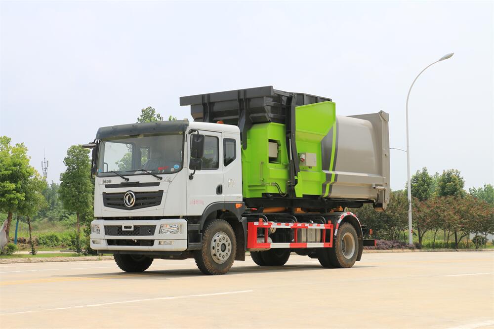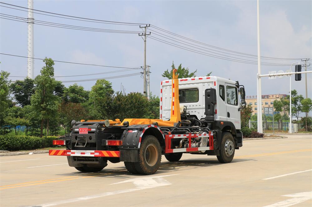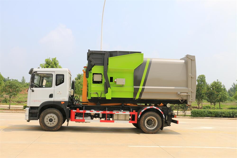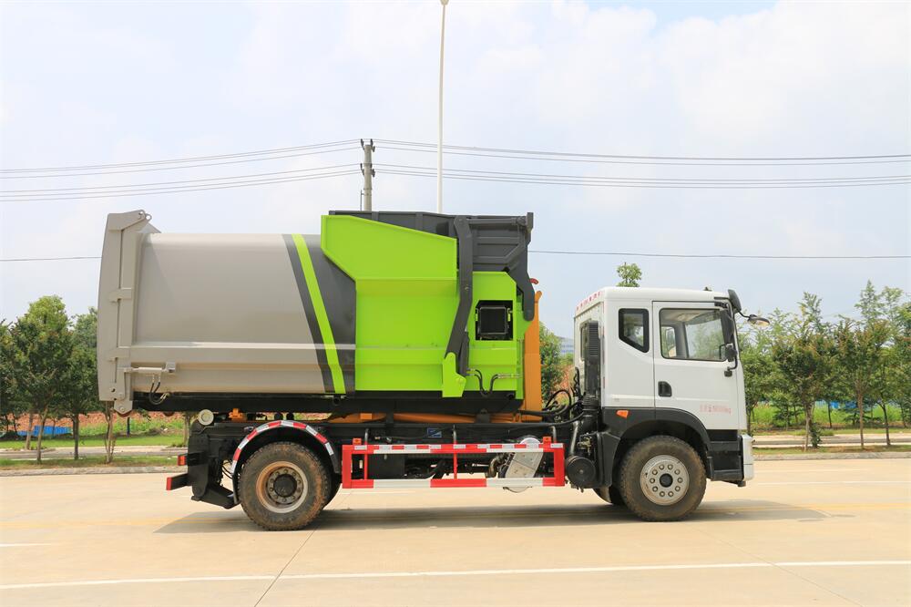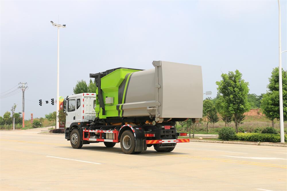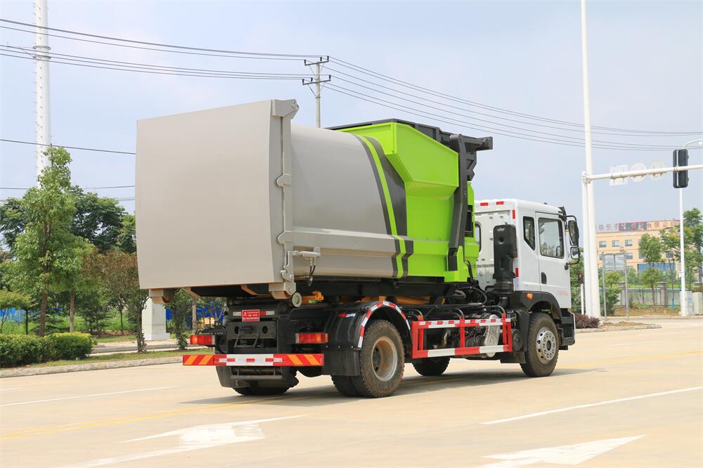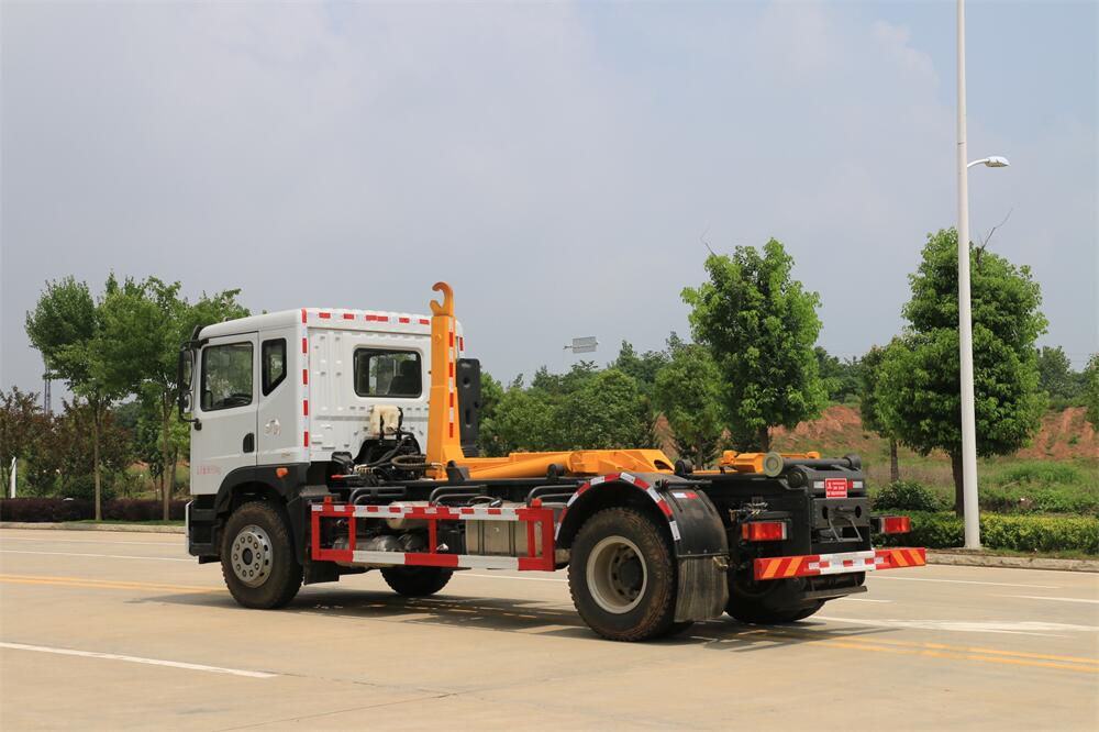 勾臂式垃圾車(車廂可卸式垃圾車)介紹: 車廂可卸式垃圾車又叫拉臂式垃圾車,是一種采用高新設計可伸縮的鉤臂,實現垃圾廂的二次吊裝,自吊上放下,可自行傾倒垃圾的環衛設備。 拉臂式垃圾車結構簡單,操作穩定方便,裝卸效率高,機械化程度高,節省人力。鉤臂垃圾車一車可帶多個垃圾廂,在裝卸的運輸過程中可有效地避免二次污染。 拉臂垃圾車采用高新設計可擺動的鉤臂,垃圾箱由框架、開啟油缸、滑輪、后門和若干加強框架與鋼板焊接而成。調換貨廂快捷方便,貨廂上帶蓋(倒垃圾時可翻開),鉤臂垃圾車垃圾廂體可選用碳鋼、不銹鋼材質、內部采取環氧樹脂防腐處理,改裝部分與原車底盤為可分離式,維修方便且保持了原車的機動性及行駛性能。