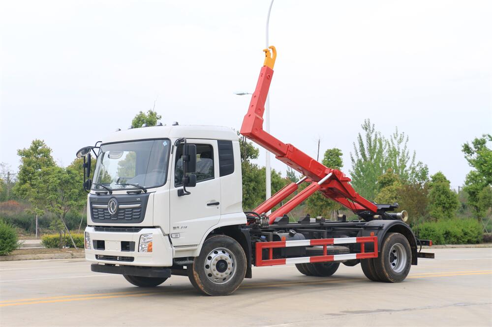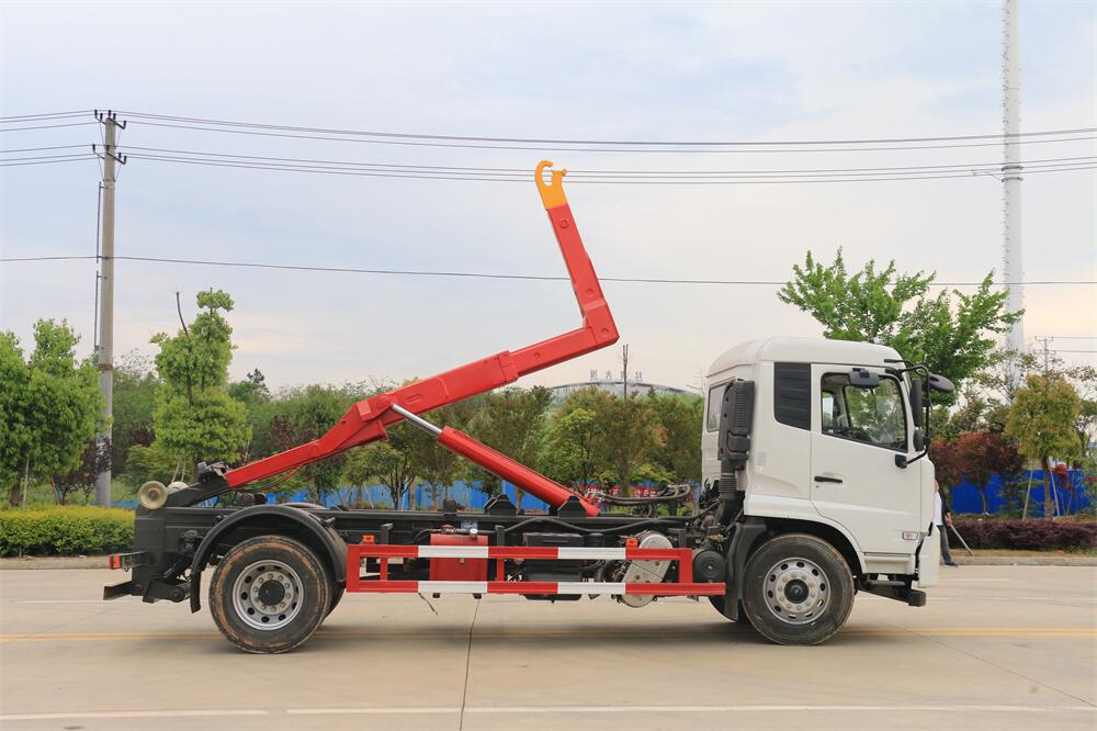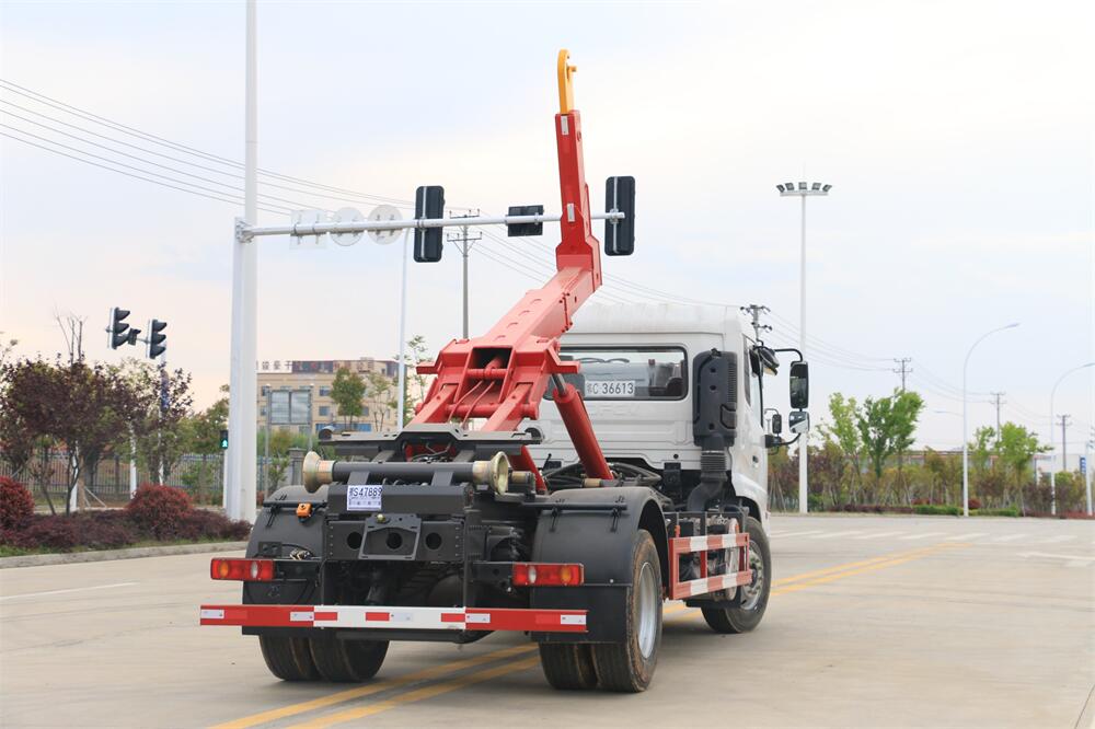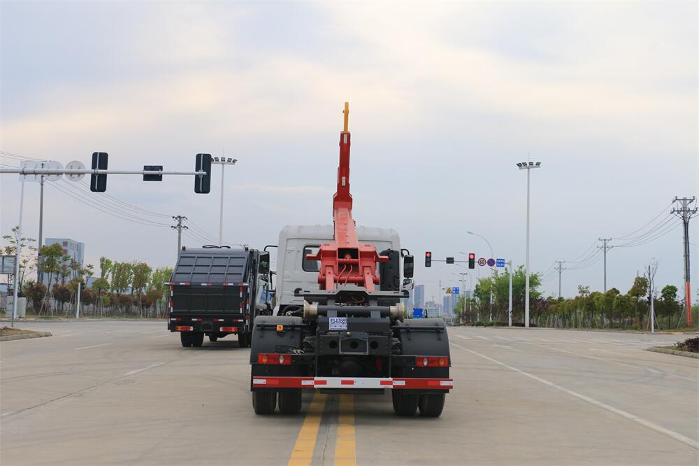 勾臂式垃圾車(車廂可卸式垃圾車)介紹: 車廂可卸式垃圾車又叫拉臂式垃圾車,是一種采用高新設計可伸縮的鉤臂,實現垃圾廂的二次吊裝,自吊上放下,可自行傾倒垃圾的環衛設備。 拉臂式垃圾車結構簡單,操作穩定方便,裝卸效率高,機械化程度高,節省人力。鉤臂垃圾車一車可帶多個垃圾廂,在裝卸的運輸過程中可有效地避免二次污染。 拉臂垃圾車采用高新設計可擺動的鉤臂,垃圾箱由框架、開啟油缸、滑輪、后門和若干加強框架與鋼板焊接而成。調換貨廂快捷方便,貨廂上帶蓋(倒垃圾時可翻開),鉤臂垃圾車垃圾廂體可選用碳鋼、不銹鋼材質、內部采取環氧樹脂防腐處理,改裝部分與原車底盤為可分離式,維修方便且保持了原車的機動性及行駛性能。