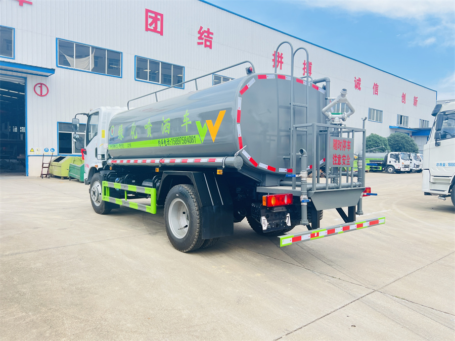 灑水車前裝有鴨形噴嘴或圓頭沖嘴,后面裝有圓柱開灑水噴嘴或蓮蓬頭噴嘴,后部有一工作平臺,裝配有水炮。后部還可裝8個噴嘴(選裝)。