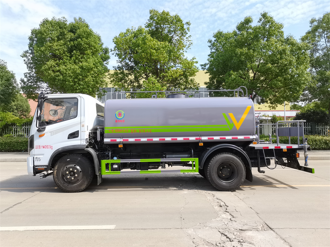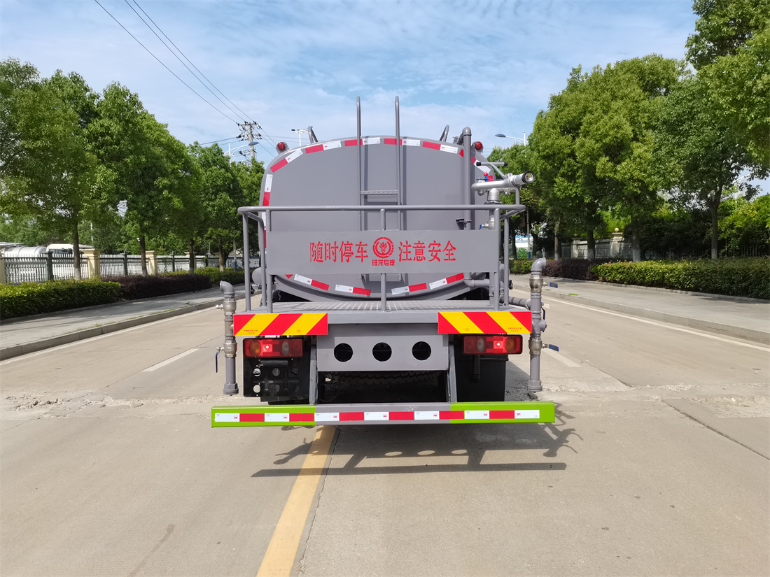 灑水車前裝有鴨形噴嘴或圓頭沖嘴,后面裝有圓柱開灑水噴嘴或蓮蓬頭噴嘴,后部有一工作平臺(tái),裝配有水炮。后部還可裝8個(gè)噴嘴(選裝)。