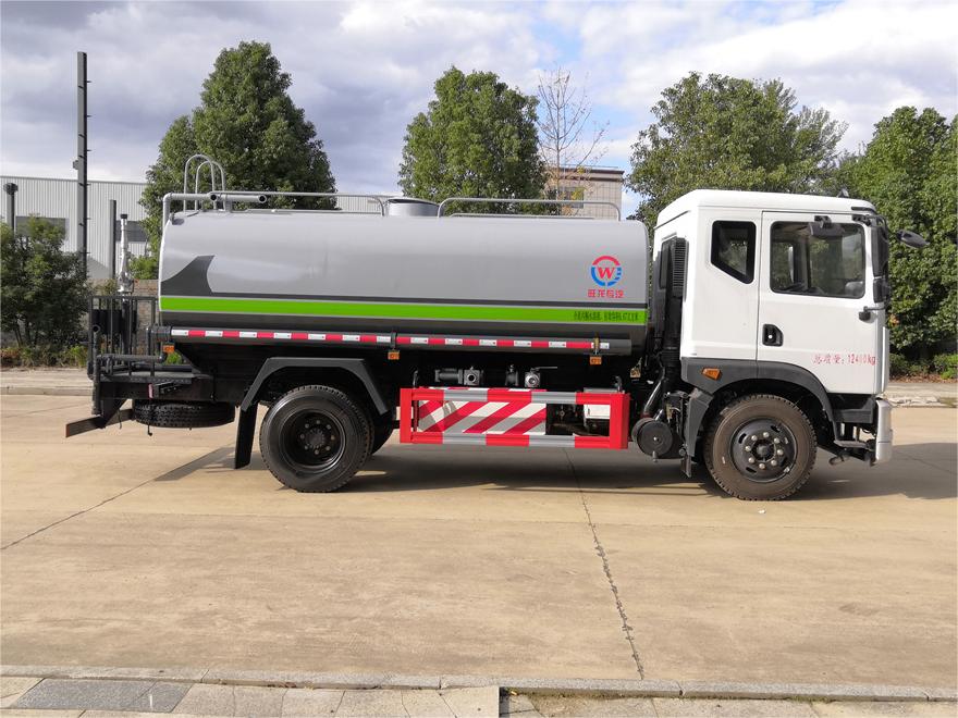 灑水車前裝有鴨形噴嘴或圓頭沖嘴,后面裝有圓柱開灑水噴嘴或蓮蓬頭噴嘴,后部有一工作平臺,裝配有水炮。后部還可裝8個噴嘴(選裝)。