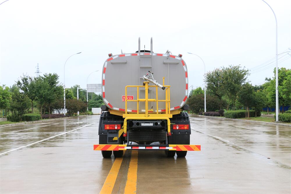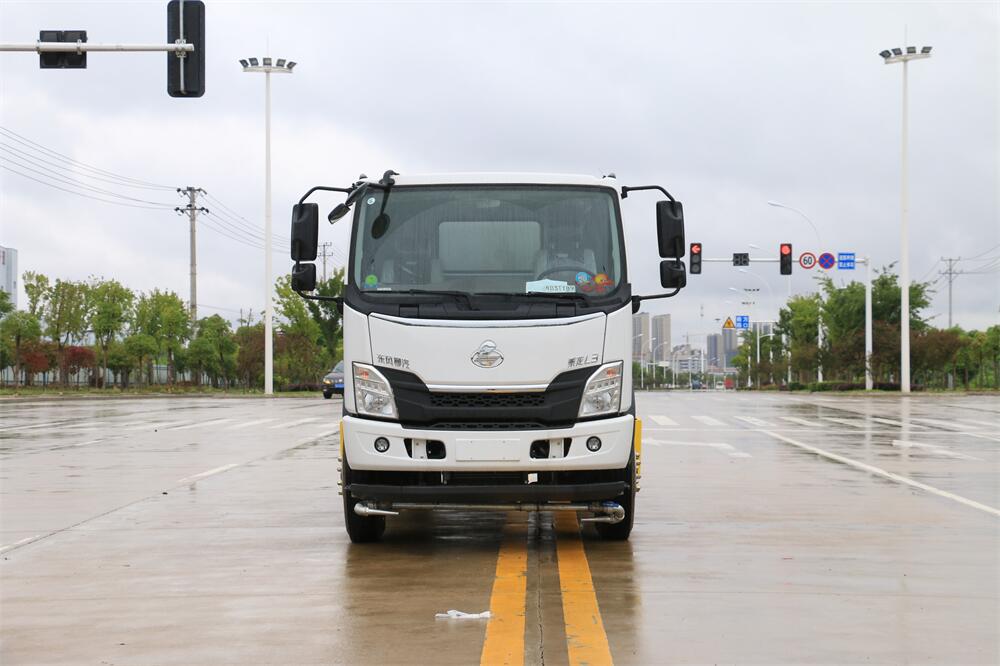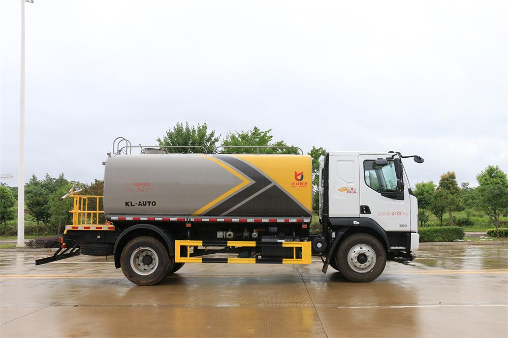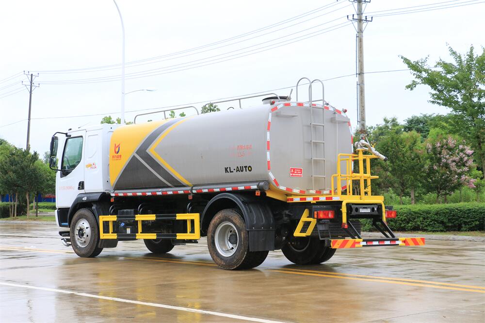 灑水車(chē)前裝有鴨形噴嘴或圓頭沖嘴,后面裝有圓柱開(kāi)灑水噴嘴或蓮蓬頭噴嘴,后部有一工作平臺(tái),裝配有水炮。后部還可裝8個(gè)噴嘴(選裝)。