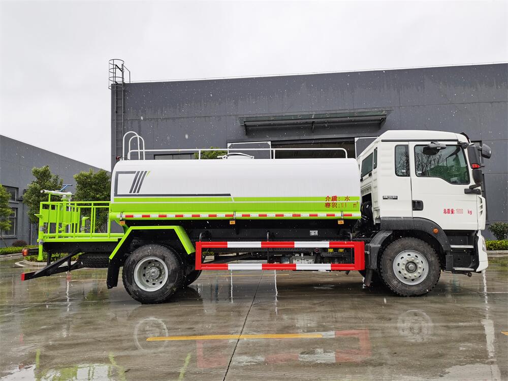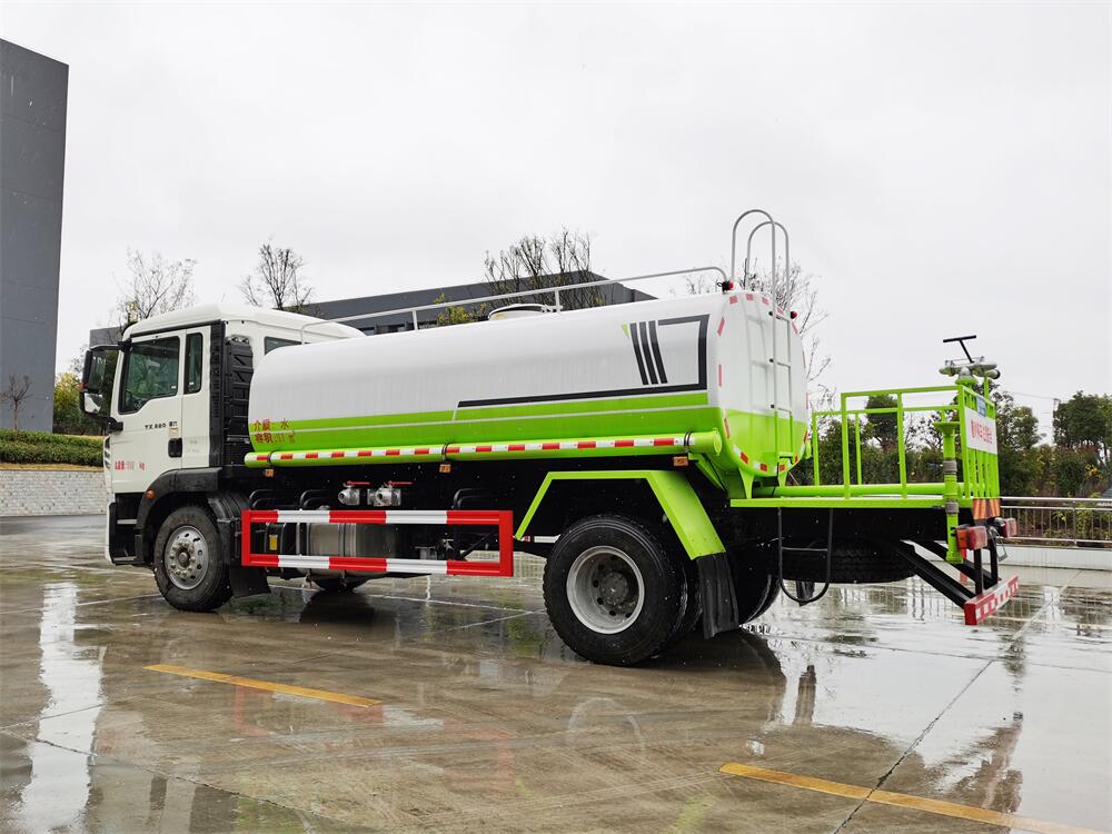 灑水車前裝有鴨形噴嘴或圓頭沖嘴,后面裝有圓柱開灑水噴嘴或蓮蓬頭噴嘴,后部有一工作平臺,裝配有水炮。后部還可裝8個噴嘴(選裝)。