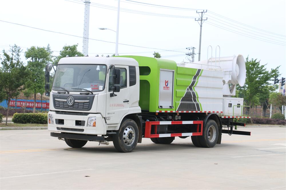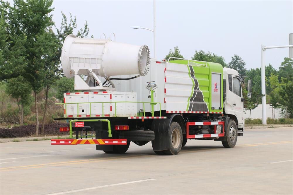 上裝配置:罐體容積為 12立方,選配風送式霧炮機組射程30米、40米、50米、60米、80米、100米、120米霧炮,罐體鋼板為4mm碳鋼Q235材質,罐內隔板具有防波作用,以減輕汽車行駛時罐體液體沖擊,罐體及整車外形尺寸按照公告。帶大功率專用灑水泵,泵可自吸自排,整車前沖、后灑、側噴、帶65消防接口,后平臺配CLW-50、CLW-60、CLW-80、CLW-100、CLW-120型風送式霧炮機組;罐體前封頭配大功率柴油發電機組;前封頭帶水位計,后平臺主管路帶1寸澆花接口,后爬梯。帶兩根輸水管及陰陽端。罐體顏色:銀/灰/綠,罐體兩側噴“多功能抑塵車”字樣,貼反光標示。