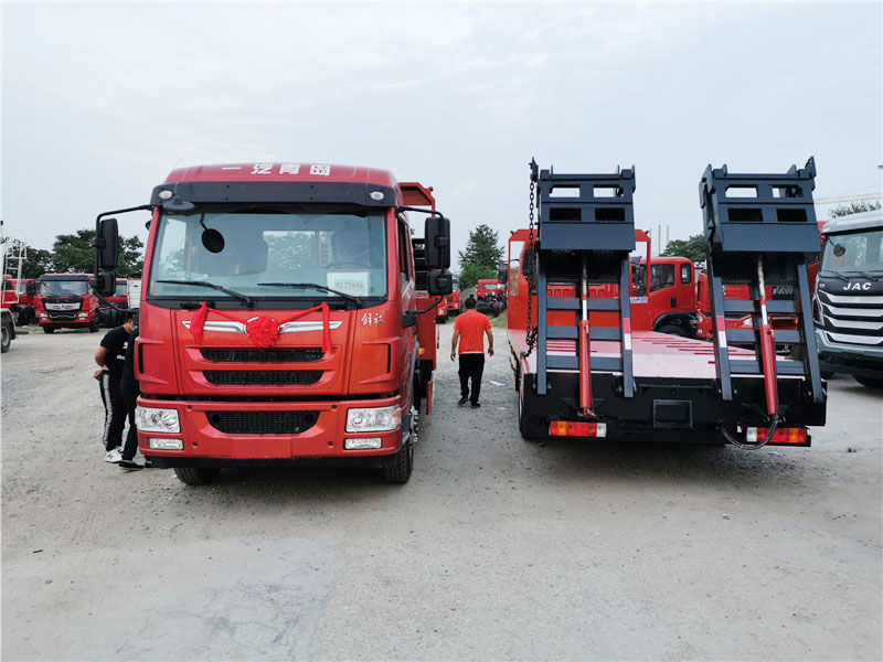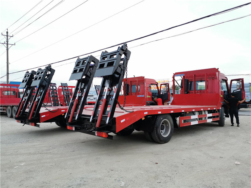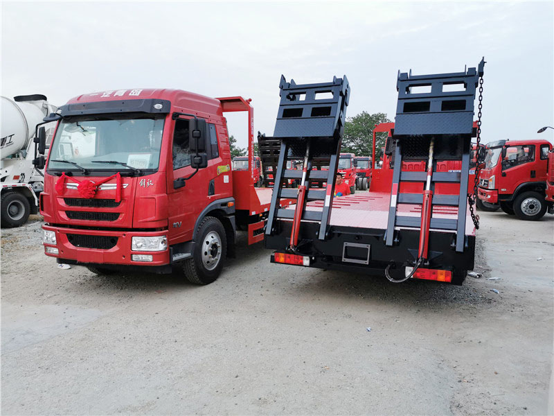 解放龍V單橋平板運輸車 一汽青島駕駛室 排放:國五新規(guī) 發(fā)動機:錫柴180馬力 變速箱:陜齒8檔 前后橋:145后橋 可選軸距:5米軸距 輪胎:900-20鋼絲胎 大梁: 250雙大梁 整車對應(yīng)尺寸:9000*2500*2900 車型亮點:ABS防抱死系統(tǒng) . 剎車間隙自動調(diào)整臂、防飛濺、中控鎖,遙控鑰匙,電動門窗,鋁合金油箱。 上裝采用五毫米花紋鋼板,100*100方鋼做橫梁,加強雙簧爬梯,可拉15噸以下挖機。 可選裝配置:液壓全自動爬梯,折疊型加長型液壓全自動爬梯,可加裝兩邊伸展,一邊可伸縮30公分。